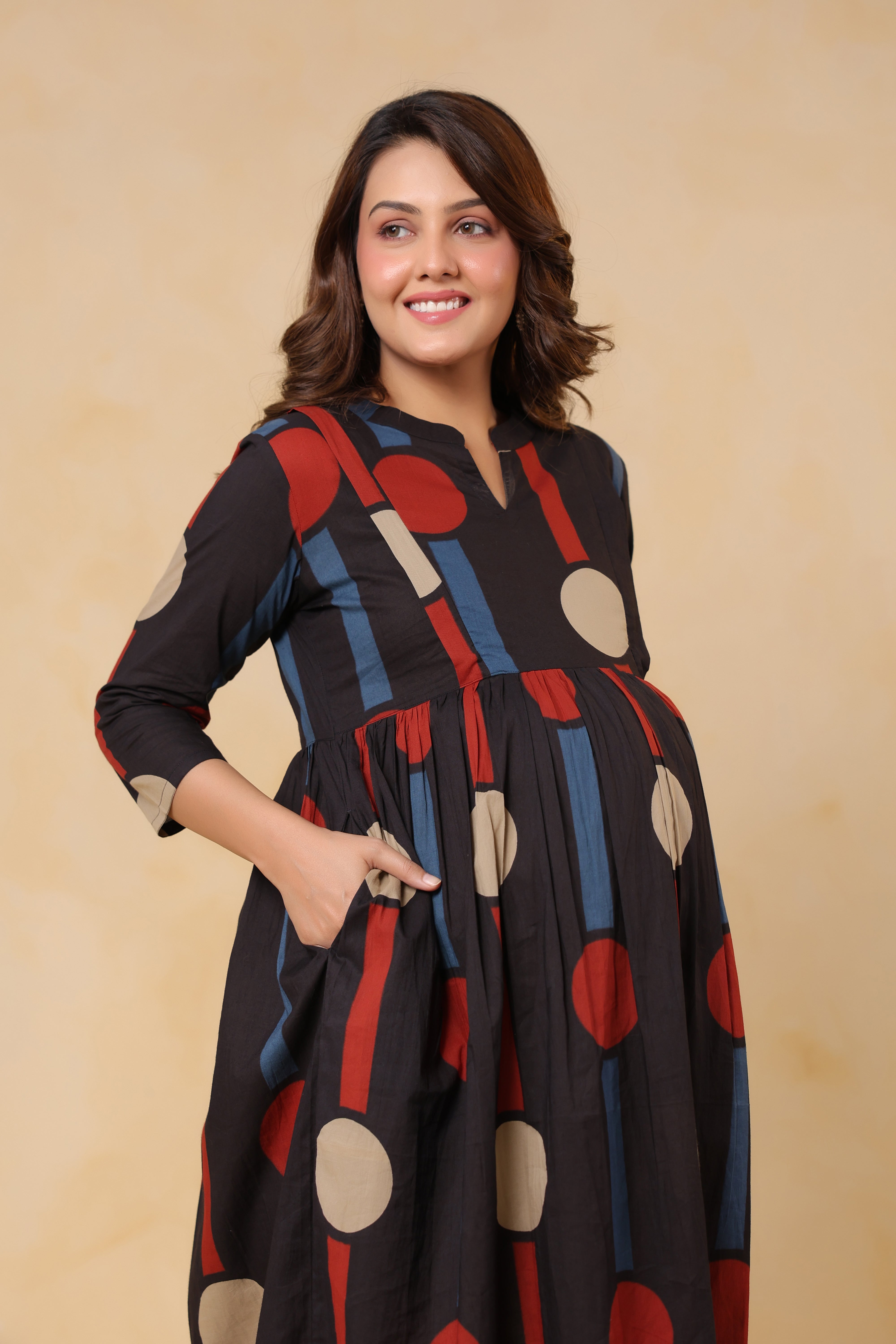 Black Geometric Ajrakh Cotton Maternity - Nursing Dress